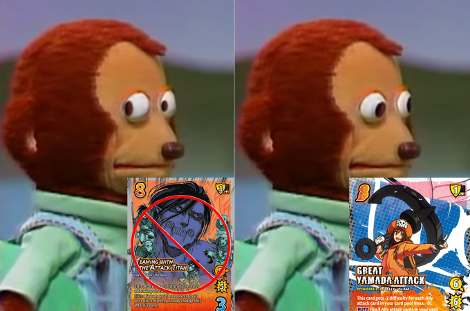 But all I can be about this character is “whelmed”. Having your resource unfairness hinge on the opponent not blocking makes that maybe a really crucial maybe. Being locked to a single keyword for deck building for what is no real equivalent boost in power also SUCKS. Imagine if Toji’s Heavenly Restriction made his forehead flicks hurt just a little bit more. That’s what it’s gonna feel like playing Happy Chaos. If you want to be stats+draw there are better, less restrictive options. Cool flavor though, and a bananas Secret Rare that I am going to make them regret printing, but a hard pass from me.